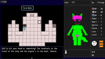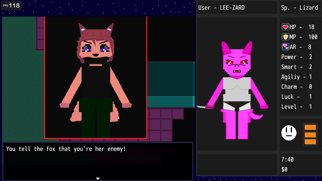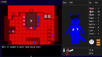 Alright, so the demo is pretty rough around the edges. I don't know how far I got in it as the last thing I did before getting my autosave got corrupted after fighting a slime was getting the second for the fox character. Right off the bat I'll say you'll really want to turn down the random encounter rate in the next demo/release. There's a decent amount of spelling errors, incorrect punctuation, and using "your" instead of "you're" or "their" instead of there. One that was pretty noticeable was the Slime's attack having an extra W in "forward". I would offer to comply a list of errors, but it's a bit hard with RPGM to do that. There's probably more I could say about the writing, but it's a bit hard to give a useful critique on it as a complete stranger. Simply I would say that the interaction with the computer felt alright, it seemed like it had a certain character to it, but the Fox not so much. It's not so much their personality, but the pace at which they deliver it, it felt like they needed a bit more dialogue and descriptions, y'know?