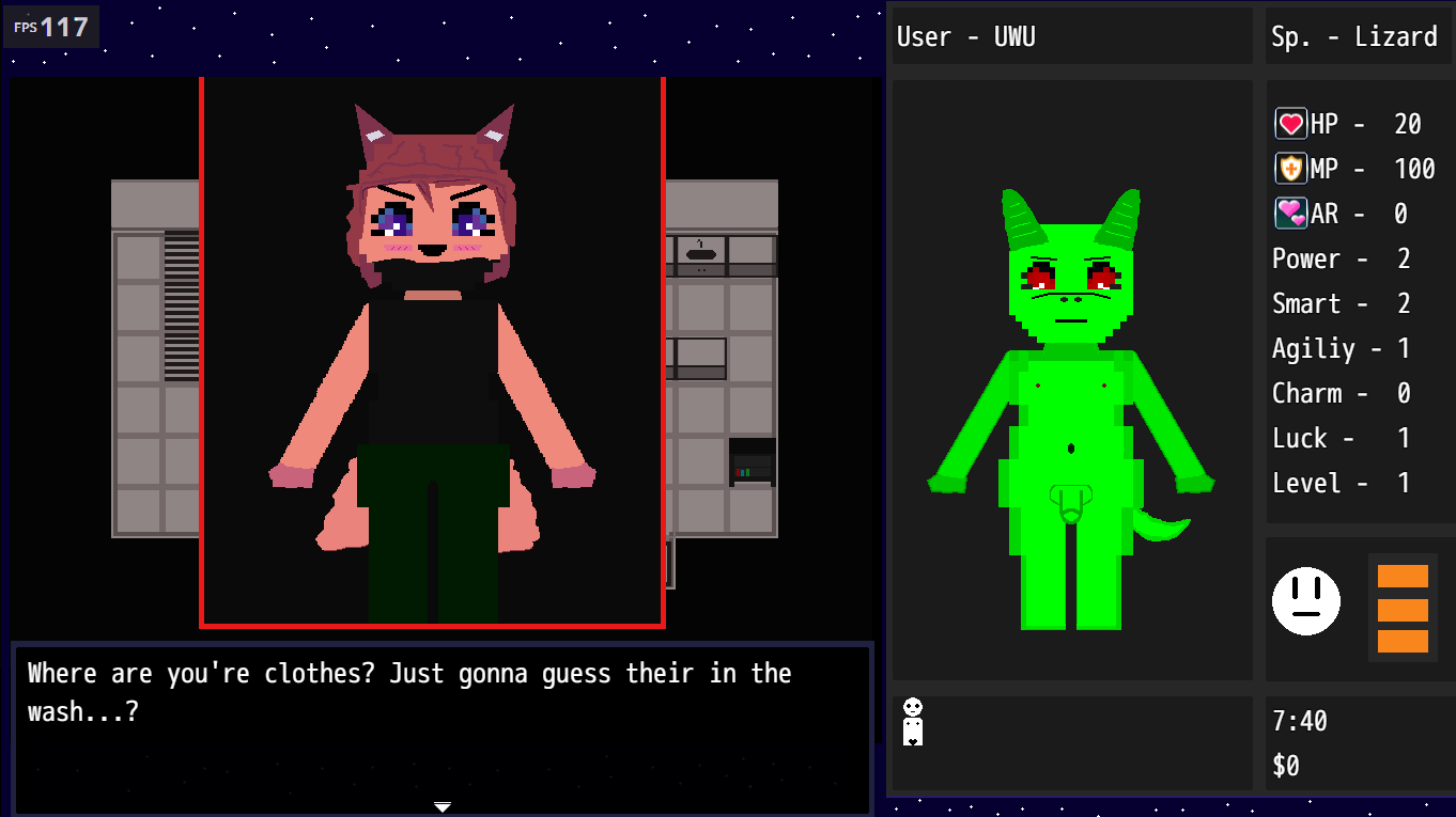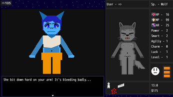 Another cool feature I've added was the battle system! It's custom-made and took a lot of working and tweaks to get it to work, but I'm proud of it. You are able to attack, use skills, talk with the enemy (wip), submit. Your stats are also able to be improved through battling and doing specific actions. You can also charm your enemies with Lust skills, an alternative way to obliterate random thugs and slimes.