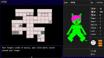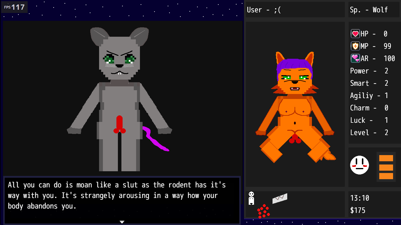 Art: Has a charm to it, though obviously amateur, but I think the player character UI is acceptable (though there's a clipping issue with the genitals on some items.) The "rat" the player fights against really doesn't look like a rat, more like a wolf, though it seems like that's a reused asset from Strict Commitment 1?