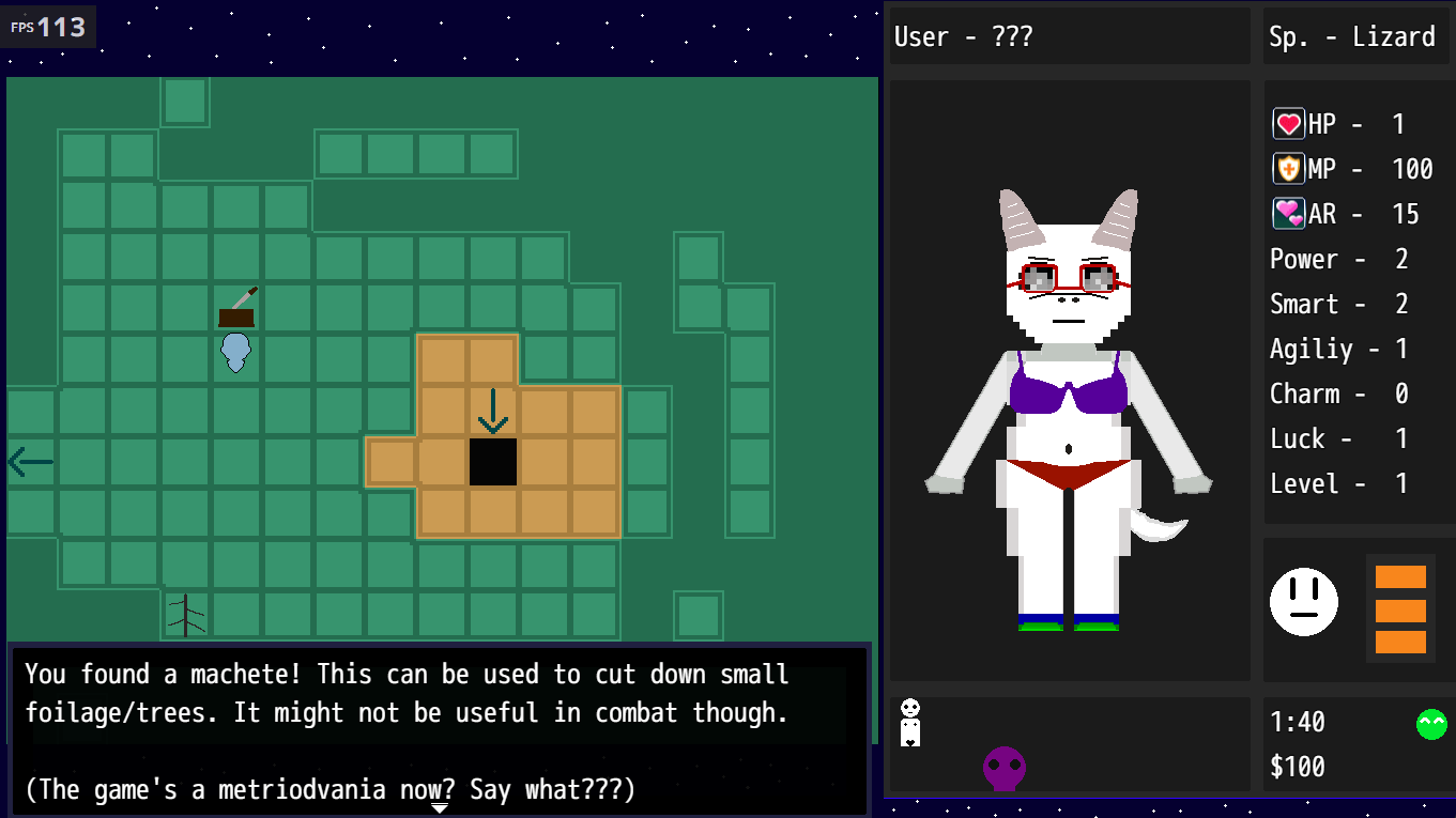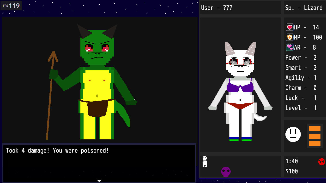 - Battle additions - You can now crit and miss. To crit you take your luck stat and 100. So X/100 chance! Enemies have a chance to dodge based on their Evasion stat which is higher in more smaller and nimble enemies.